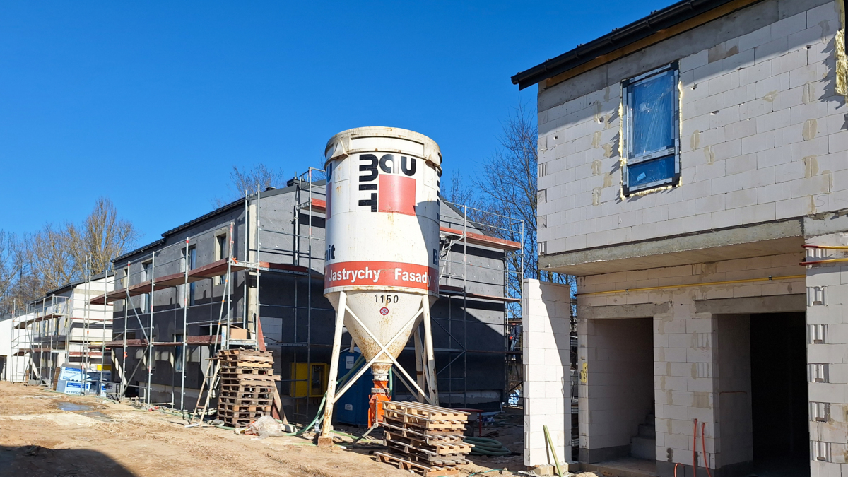 Na budynkach realizowanych w ramach etapu 4 i 5 trwają obecnie prace związane z elewacją oraz tynkami wewnętrznymi.