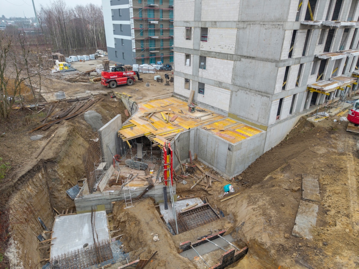 Cześć A – zakończono wykonanie konstrukcji żelbetowej stanu zero bez otworów technologicznych, a konstrukcja żelbetowa kondygnacji +5c (4 piętro) jest prawie zakończona.
